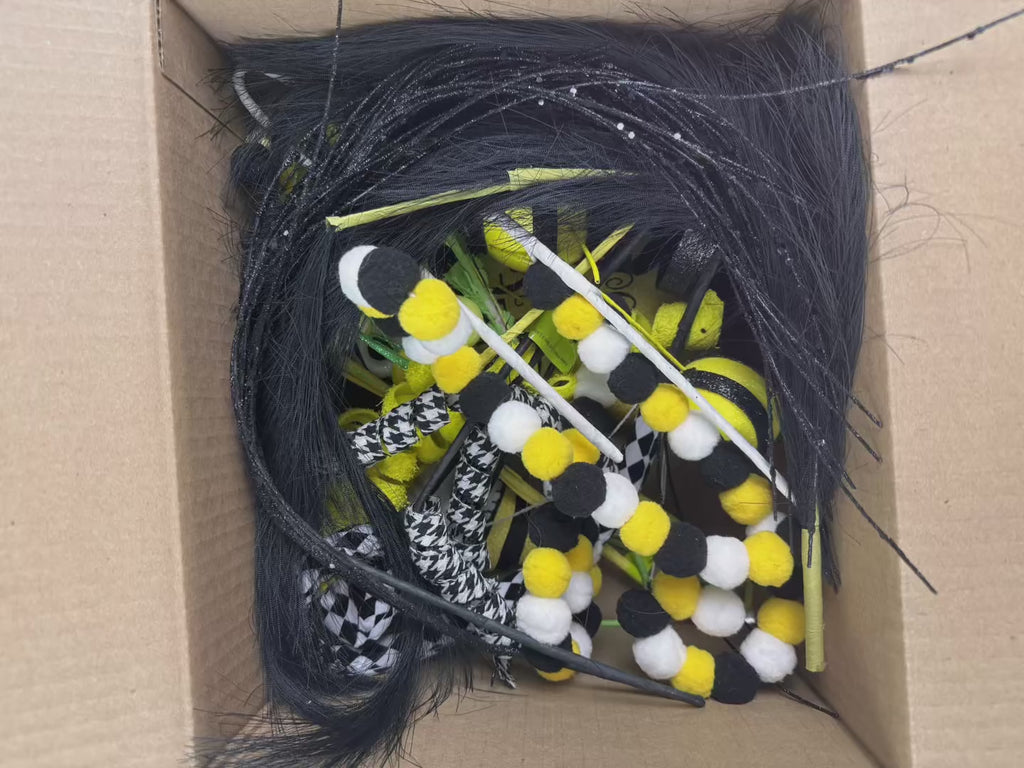 Create a buzz of joy with this pre-loved bumble bee–themed décor box! Bursting with cheerful yellow, black, and white accents, it includes whimsical elements like glittered bee picks, fuzzy pom-poms, playful florals, and a “Bee Blessed” hive sign. Perfect for adding a sweet and uplifting touch to wreaths, centerpieces, or seasonal displays, this box is all about spreading warmth and positivity while giving these pieces a second chance to shine.
